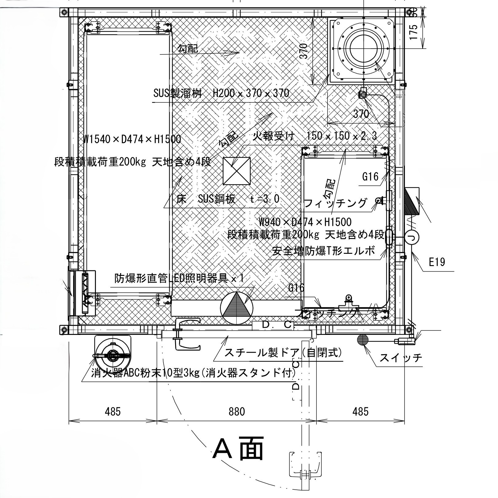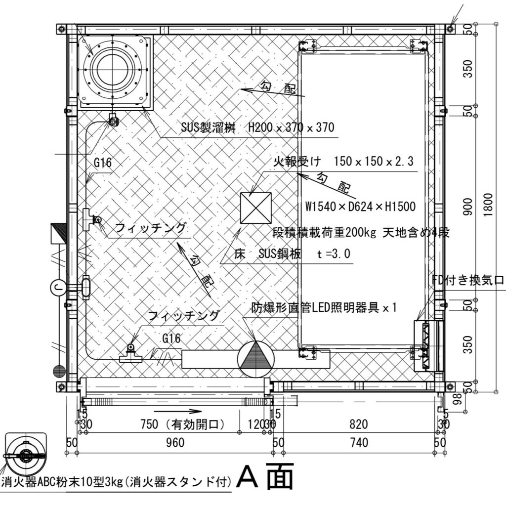 現在の『鐘馗くん』は、消防申請時に貯蔵する危険物、設置する位置に合わせて完全オーダーで製作した危険物庫です。(外寸、建具、電材、吸気口、排気口位置など)