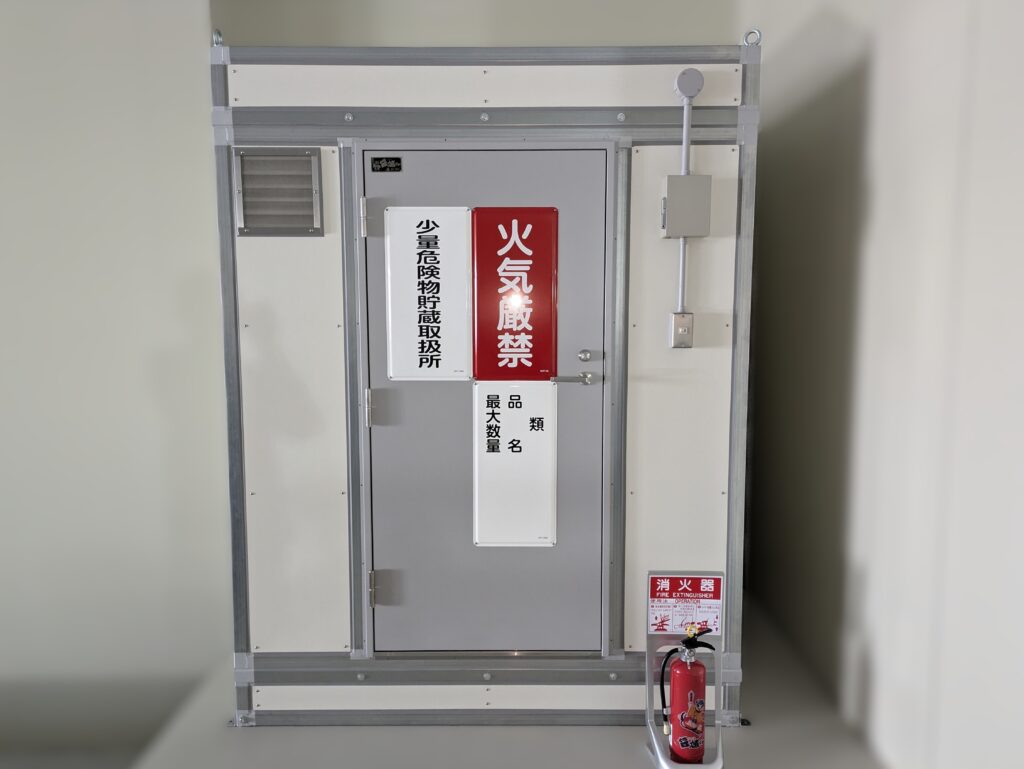 割増料金ですが、パーツを細分化する仕様です。2重床ですが、コンクリート面に製品の固定を行いました。禁水物質を貯蔵するため専用標識を取り付けました。
